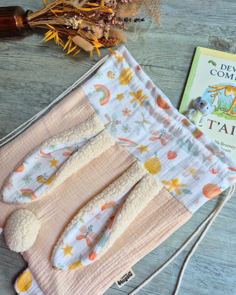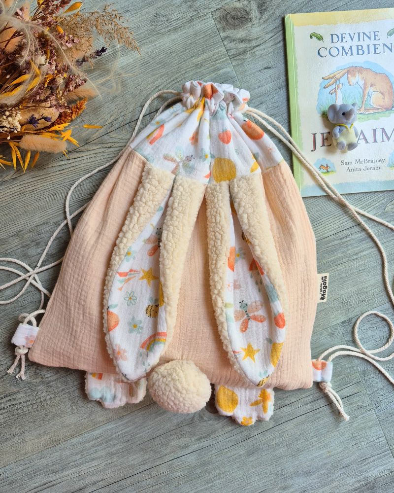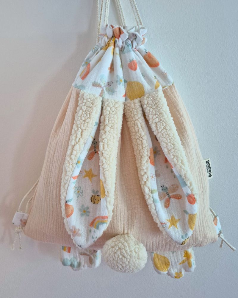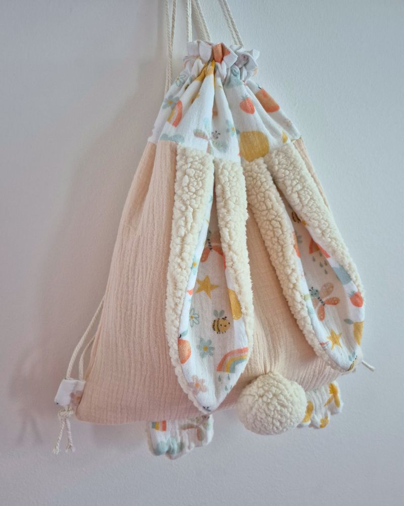 Un sac pratique, durable et plein de charme avec ses oreilles et pattes de lapins, qui suivra votre enfant dans toutes ses aventures.