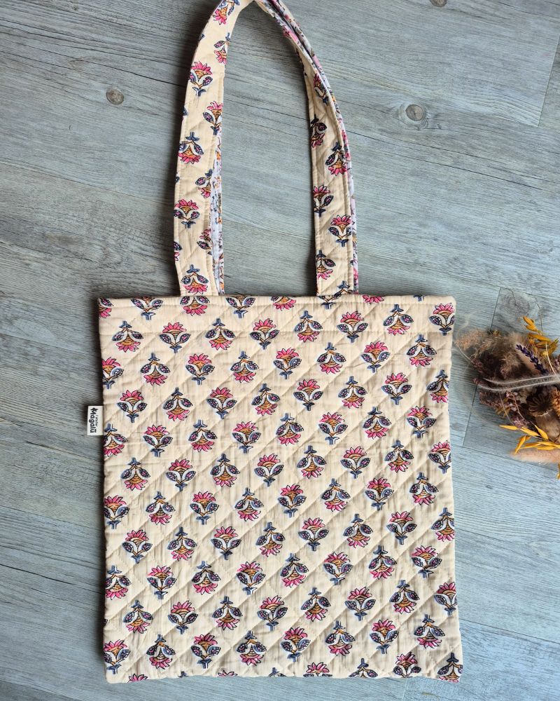 Sa grande contenance permet de transporter facilement tout le nécessaire du quotidien, tandis que son tissu indien matelassé lui donne un look raffiné, bohème et joyeux.
